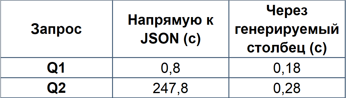 - q1: вложенное поле было извлечено из большого поля JSON с помощью генерируемого столбца, что позволило сократить затраты на передачу данных и увеличить скорость более чем в 4 раза.